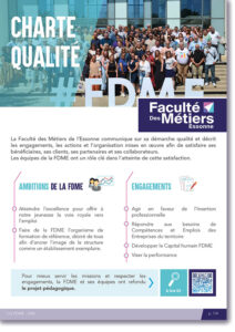La Faculté des Métiers de l’Essonne communique sur sa démarche qualité et décrit les engagements, les actions et l’organisation mises en œuvre afin de satisfaire ses bénéficiaires, ses clients, ses partenaires et ses collaborateurs. Plusieurs documents pour mieux en comprendre les détails et les enjeux sont mis à disposition :