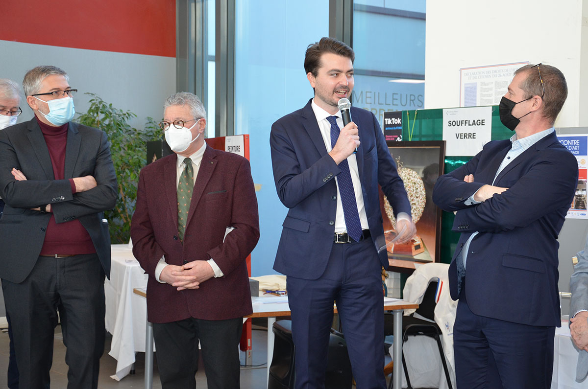 3 – Cérémonie de remise des clefs de la voiture pédagogique des pompiers aux représentants du SDIS : Guy CROSNIER, Président du conseil d’administration et Patrick VAILLI, colonel hors classe, directeur départemental. En présence de nombreux élus du territoire tels que Nicolas LEFÈVRE, Sous-préfet à la relance, Medhy ZEGHOUF, Vice-président de la CAGPS et adjoint au Maire d’Évry-Courcouronnes en charge de la culture et du patrimoine de l’enseignement et de la recherche, Patrick RAKOTOSON, président CCIE, sans oublier Jean-Claude CROZON, président du Rotary Club Évry-Corbeil venus également assister à l’allocution du salon des métiers d’art.